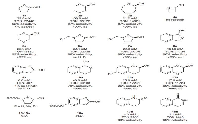 半缩醛在化学合成和药物开发中是非常重要的合成中间体。传统化学法合成中,半缩醛的合成主要通过醇和醛/酮之间的加成反应,或采用金属催化剂还原内酯来获得。除此以外,手性半缩醛的立体选择性控制也具有一定的挑战性。虽然酶法催化在有机物合成方面具有广泛的应用,但由于酶催化通常在水介质中完成,而半缩醛在水中极度不稳定,所以酶法合成手性半缩醛鲜有报道。
