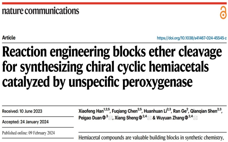 近日,我校化学与材料学院青年教师韩小峰博士在手性半缩醛合成方面取得重要进展,并以第一作者将研究成果“Reaction engineering blocks ether cleavage for synthesizing chiral cyclic hemiacetals catalyzed by unspecific peroxygenase”在国际顶级期刊《Nature Communications》上发表。内蒙古民族大学为该成果的第一完成单位。