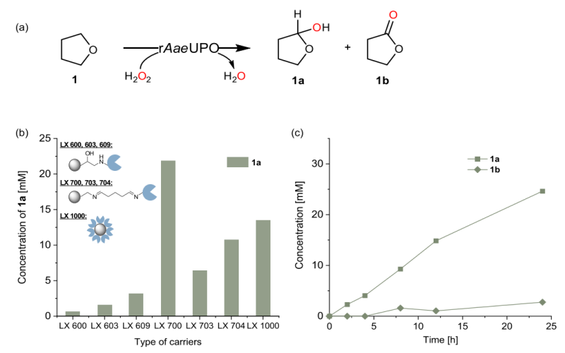 图2.(a)过氧合酶催化环醚底物反应路径;(b)固定化载体筛选;(c)产物浓度-时间曲线