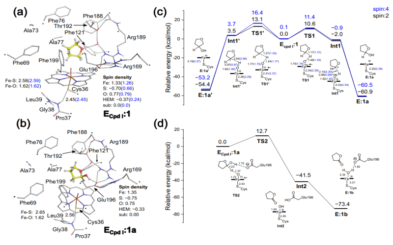 研究团队通过分子动力学模拟和量子化学计算,提出了过氧合酶(AaeUPO)催化环醚转化为半缩醛,进而转化为内酯的可能反应机理。这项工作展示了手性半缩醛合成的一种新方法,为过氧合酶在合成化学中的应用奠定基础。