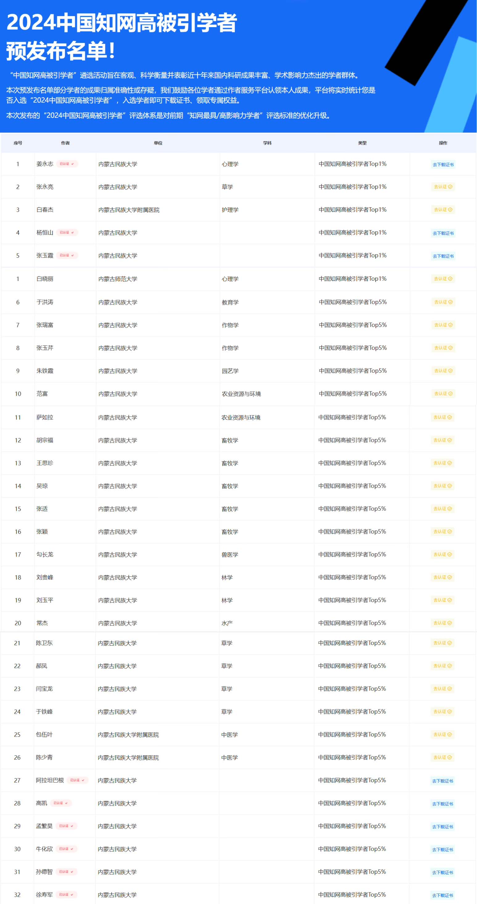 杨恒山、姜永志、张永亮、白春杰、张玉霞5名教师入选“2024中国知网高被引学者TOP1%”,于洪涛、张瑞富、张玉芹、朱铁霞、范富、萨如拉、胡宗福、王思珍、吴琼、张适、张颖、勾长龙、刘贵峰、刘玉平、常杰、陈卫东、郝凤、闫宝龙、于铁峰、包伍叶、陈少青、阿拉坦巴根、高凯、孟繁昊、牛化欣、孙德智、徐寿军27名教师入选“2024中国知网高被引学者TOP 5%”。
